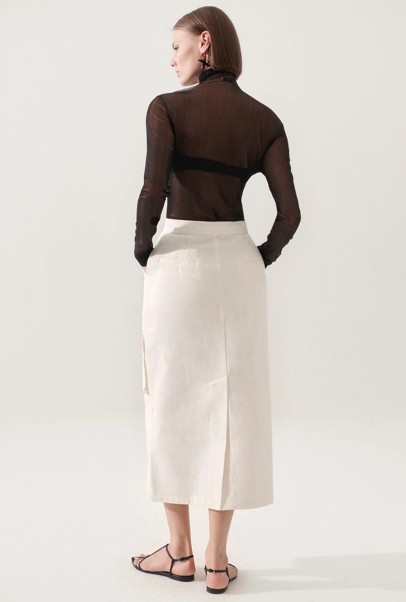 Silk Laundry Cargo Skirt, crafted from 100% BCI organic cotton twill with a soft wash finish. This skirt features a functional adjustable elastic waist, ample storage with front patch, side, and back pockets, and a fly front for ease of wear.