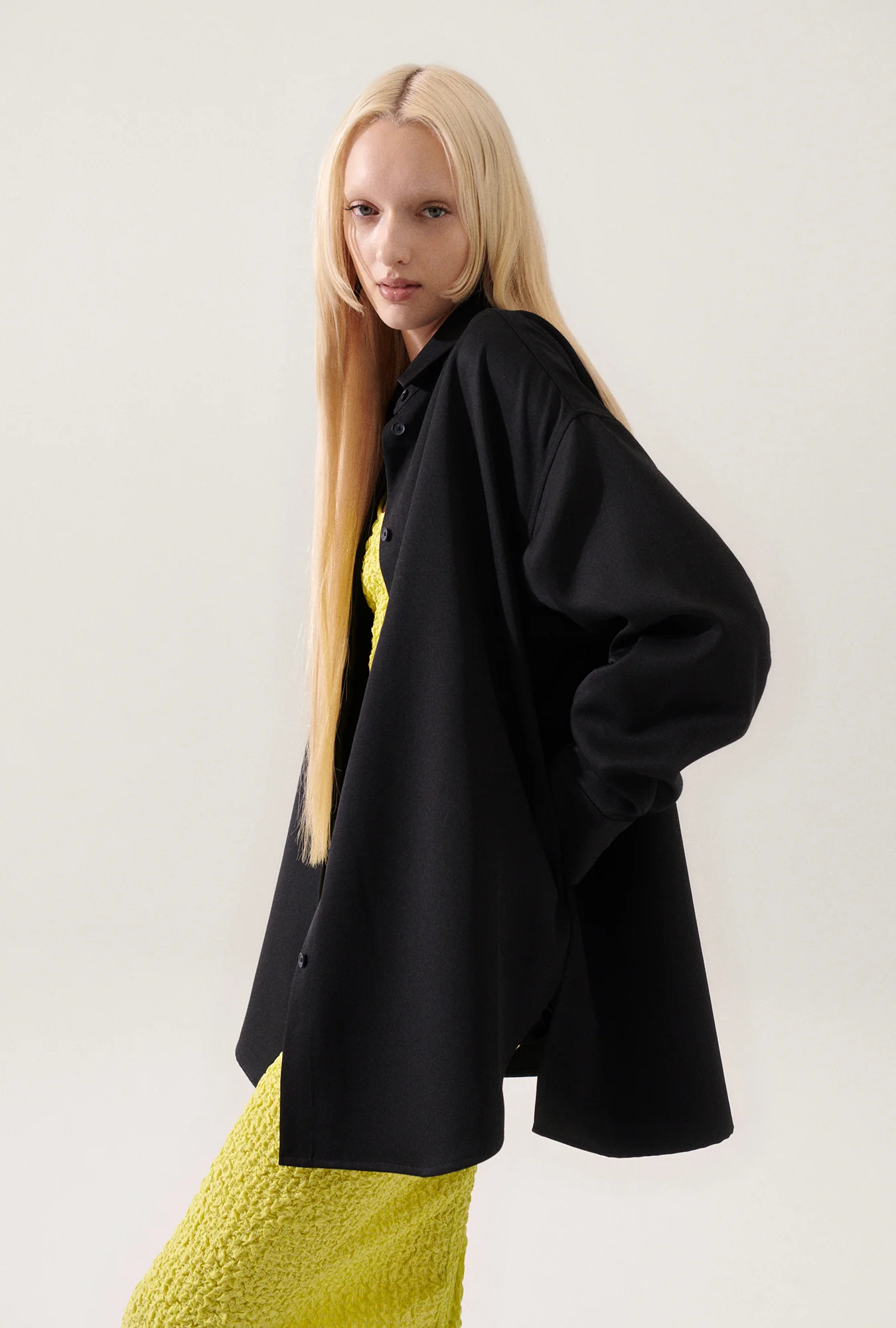 Silk Laundry wool overshirt, tailored for an oversized fit, and crafted from 100% wool. This piece features a button front placket, button cuffs, and a curved hemline, complemented by practical side pockets and a structured back yoke.